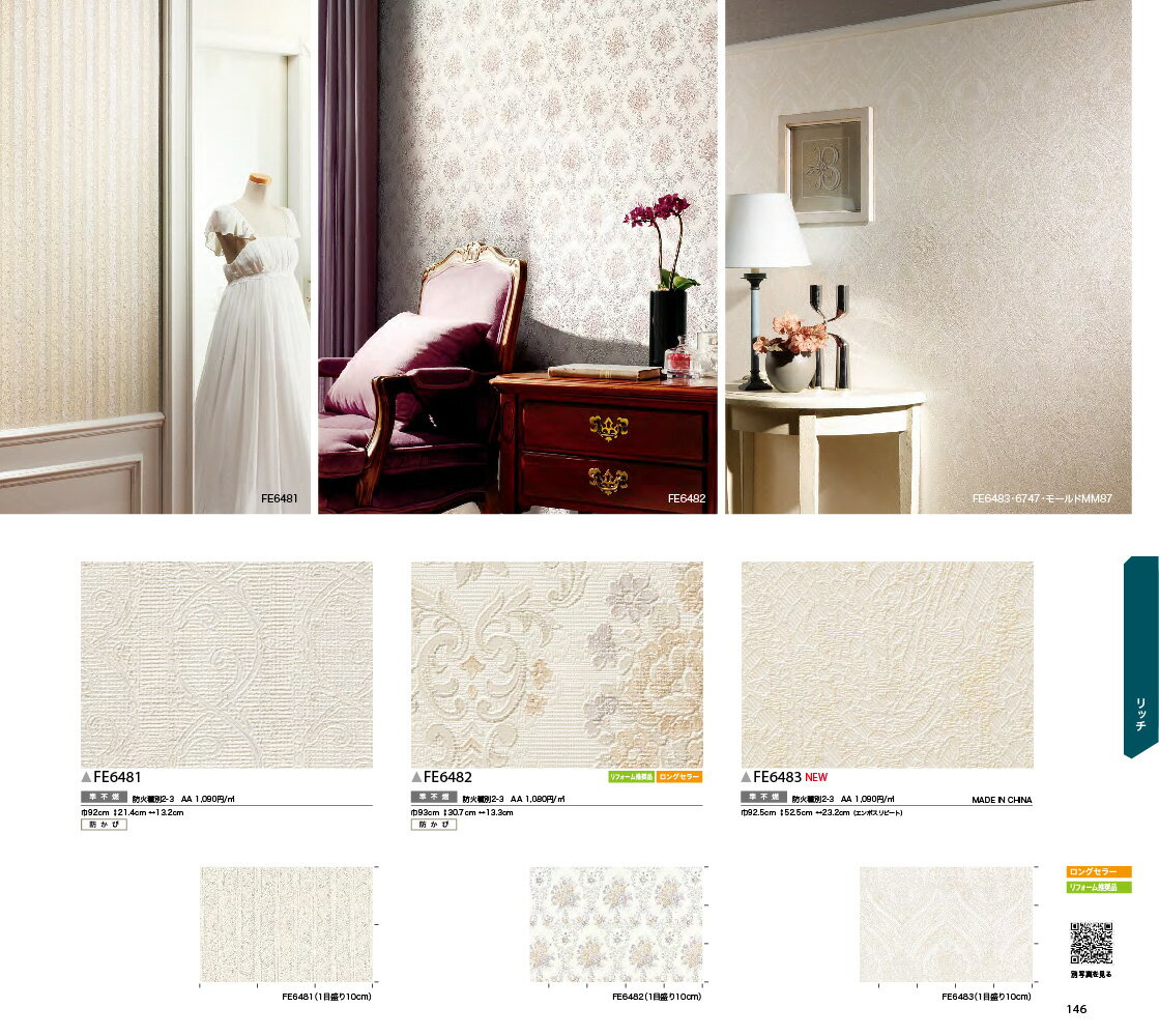 種 別 パターン リッチ 規 格 ■FE6481 :巾92cm ■FE6482 :巾93cm ■FE6483 :巾92.5cm リピート ■FE6481 :タテ 21.4cm ヨコ 13.2cm ■FE6482 :タテ 30.7cm ヨコ 13.3cm ■FE6483 :タテ 52.5cm ヨコ 23.2cm (エンボスリピート) 防火性能 準不燃 機 能 ■FE6481 :防かび ■FE6482 :防かび ■FE6483 :なし 備 考 ■FE6483 :MADE IN CHINA ■共通 注意事項 ※ご注文が分かれると、同じ品番でもロット(商品の生産単位)が異なる可能性があり、微妙な色・柄の違いがでる場合があります。
