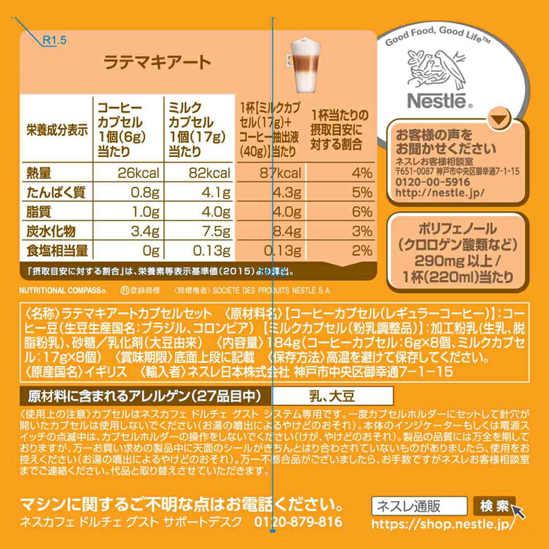 原材料名: ・レギュラーコーヒー コーヒー豆(生豆生産国名:ブラジル、コロンビア) ・乳等を主要原料とする食品 全粉乳、砂糖、乳化剤(大豆由来) 輸入者: ネスレ日本株式会社 兵庫県神戸市中央区御幸通7-1-15 ネスレハウス